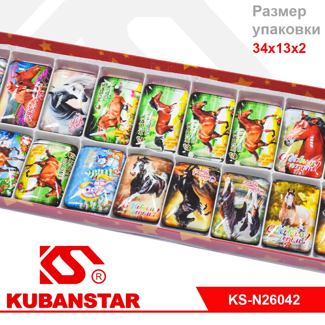 Магнит прямоугольной формы со стеклянной фронтальной поверхностью с изображением символа 2026 года - лошадью.