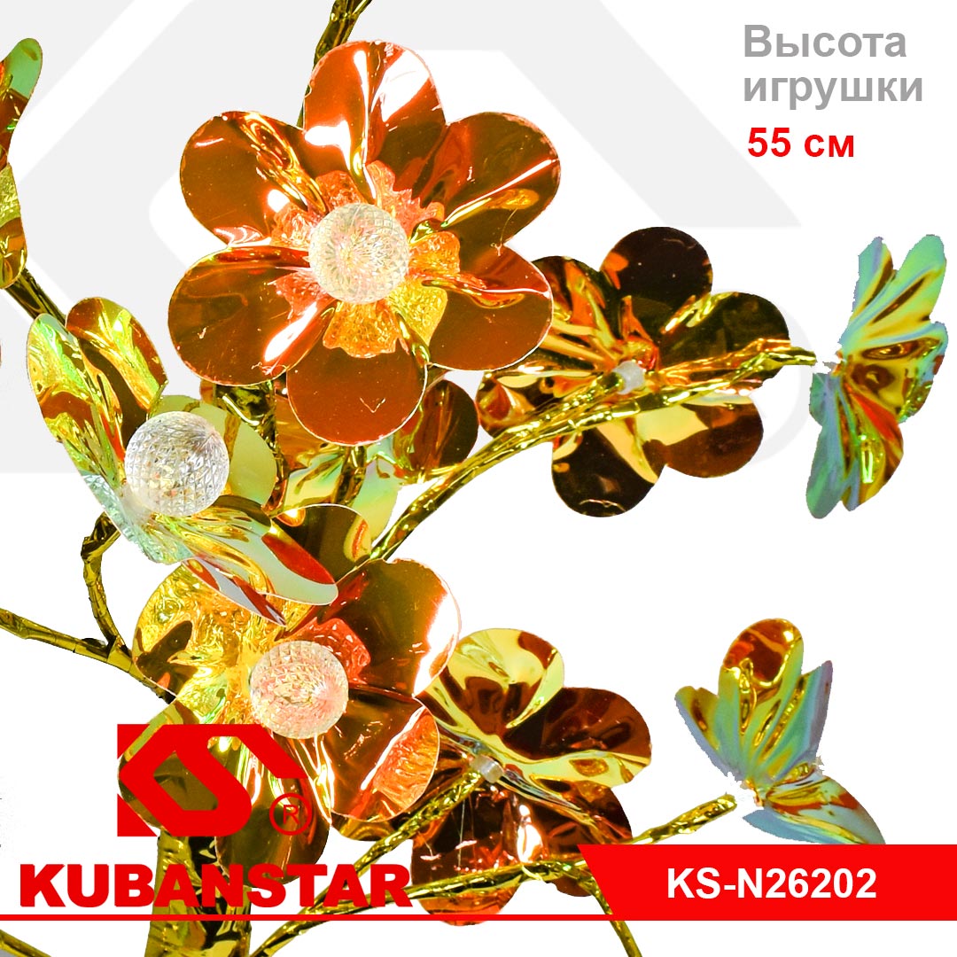 Отличное украшение на новогодний праздник - золотистое дерево с цветками, в каждый из которых вставлена лампочка, светящаяся теплым белым огоньком. Высота украшения - 55 см.