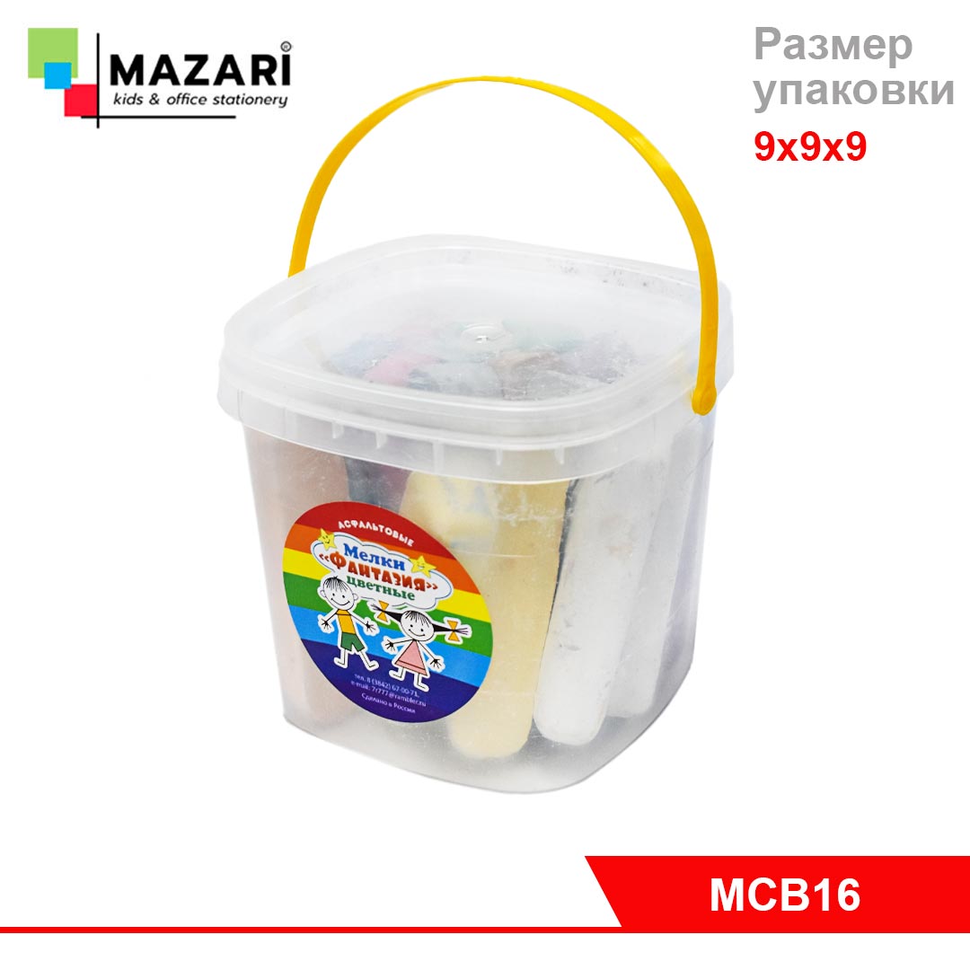 Набор, состоящий из шестнадцати цветных мелков в пластиковом ведерке с ручкой для рисования на асфальте. Тип изделия: набор мелков Твердость: средняя Количество цветов: 8 Количество мелков в упаковке: [Подробнее...]