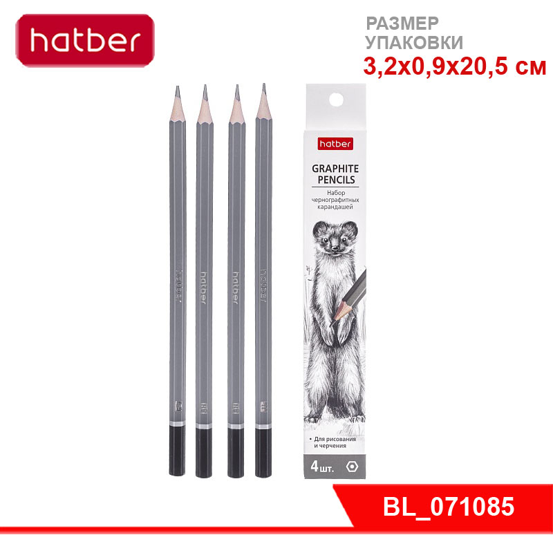 Набор карандашей чернографитных Hatber шестигран. корпус 4шт. разной твердости (H HB HB B)