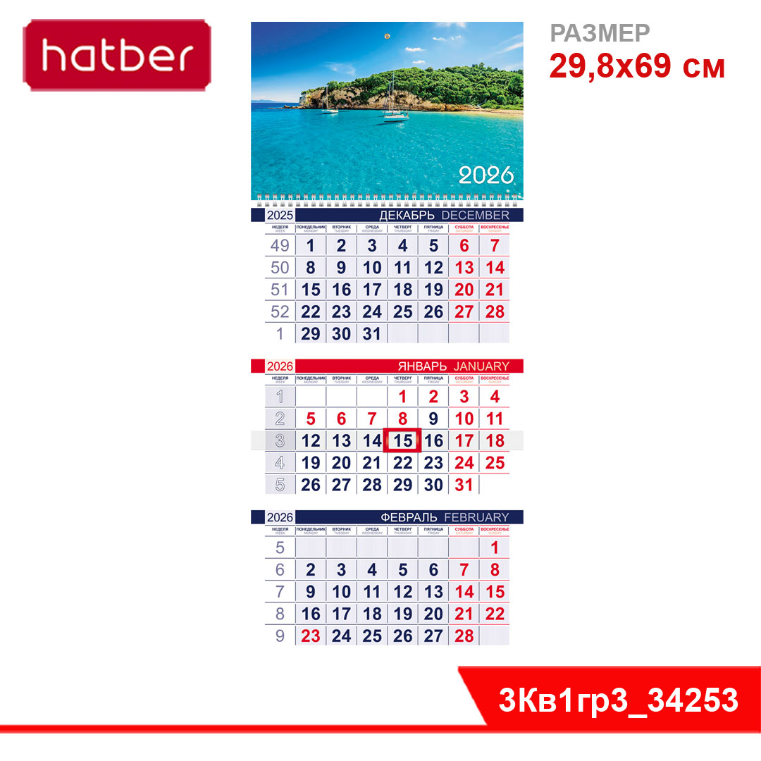 Календарь квартальный 3-х блоч. на 1 гребне 298х690мм на 2026г-Голубая лагуна-