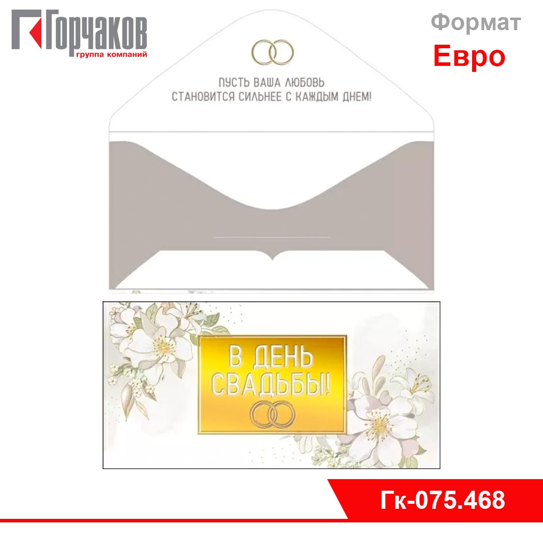 Поздравительный конверт для денег ко дню свадьбы. Изображение покрыто золотой фольгой. Материал — плотный картон высокого качества. Размеры — 168х84 мм. Количество экземпляров в одной упаковке — 10 штук. Тип изделия: [Подробнее...]